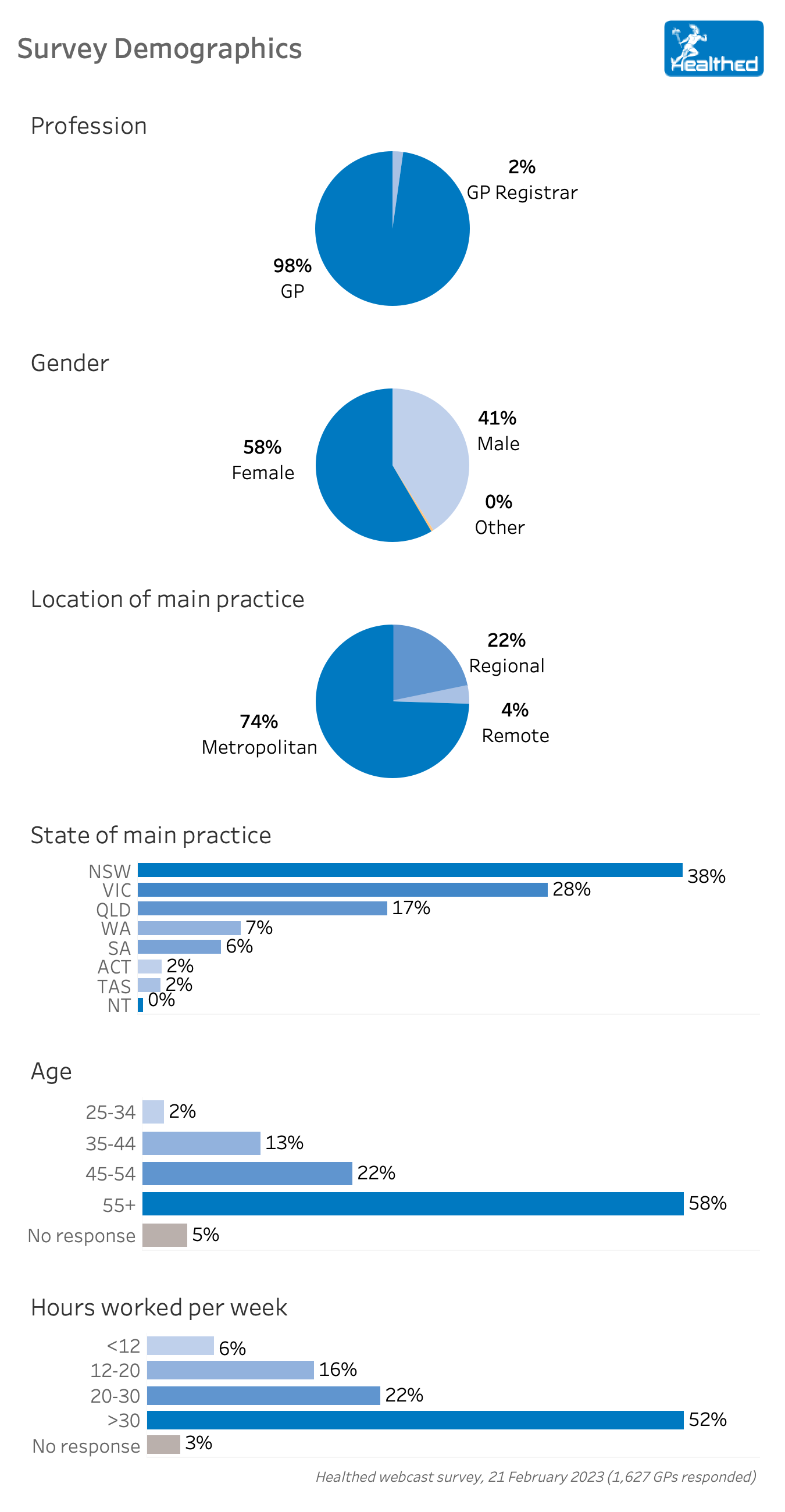 A total of 1,627 GPs responded to Healthed’s survey, which opened on 21 February 2023. GPs were allowed to skip questions, which is why each question has a different number of GP participants. Survey demographics are summarised in the charts below.